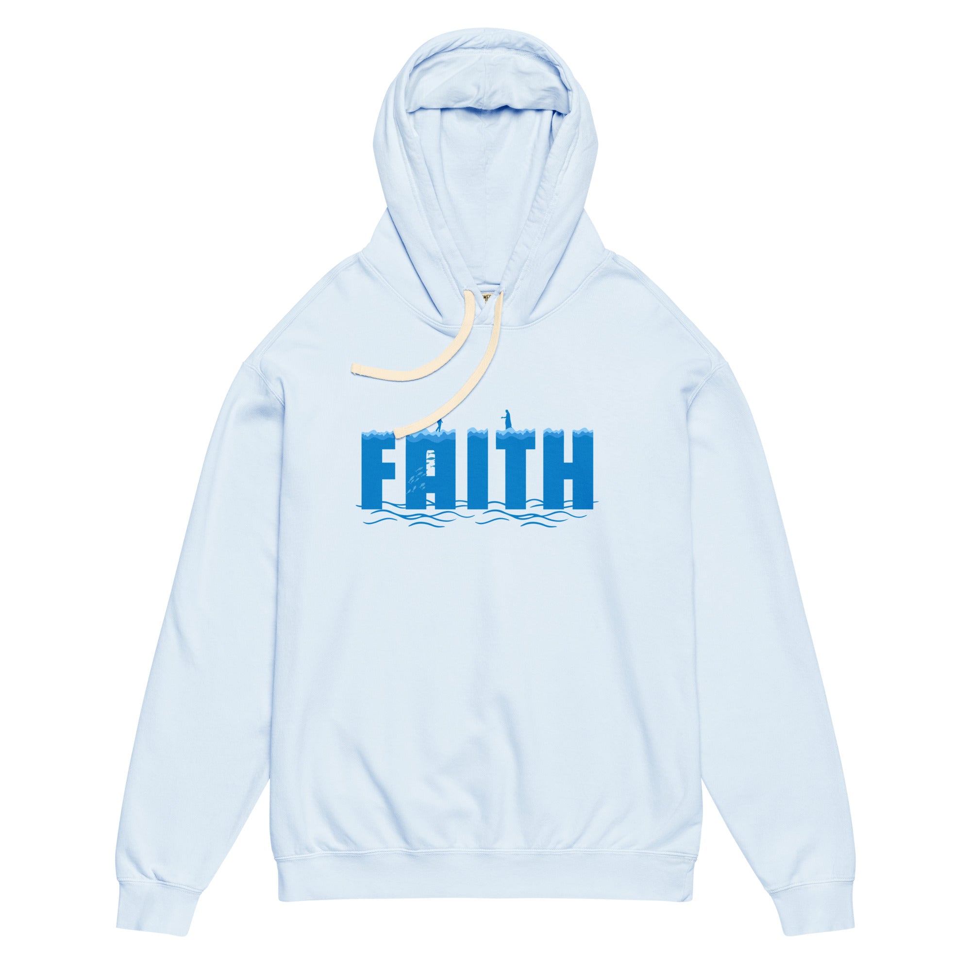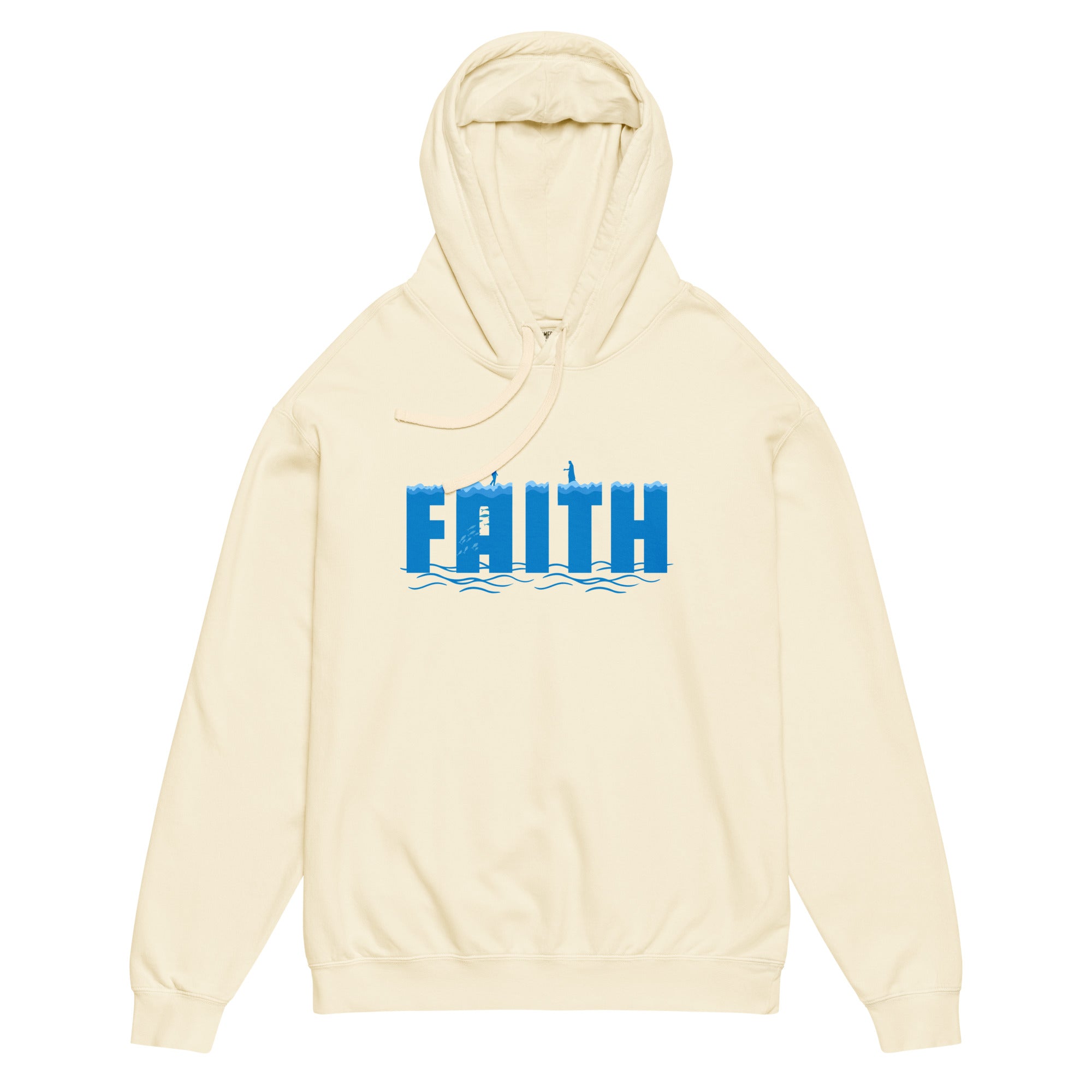 This hoodie captures a powerful moment: a man walking on water, eyes locked on Jesus who stands ahead, hand extended in invitation. It's a visual reminder that even when the path feels uncertain, Christ is constant.