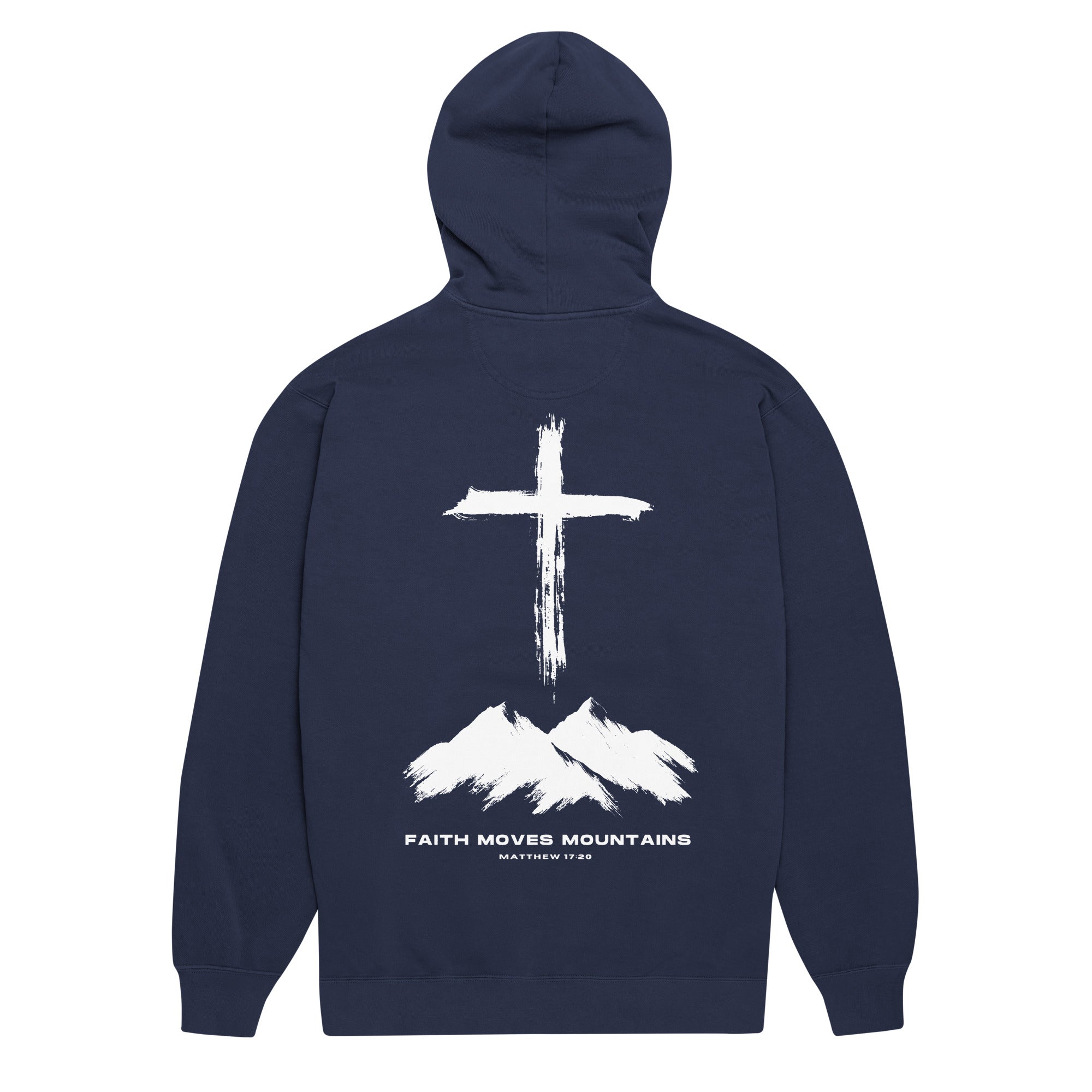 The back features a hand-brushed cross standing boldly over rugged peaks, inspired by Matthew 17:20 — a reminder that even faith as small as a mustard seed can move mountains. The front keeps it clean with the Mountain Faith Co. logo, creating a simple yet powerful look that speaks faith without saying a word.